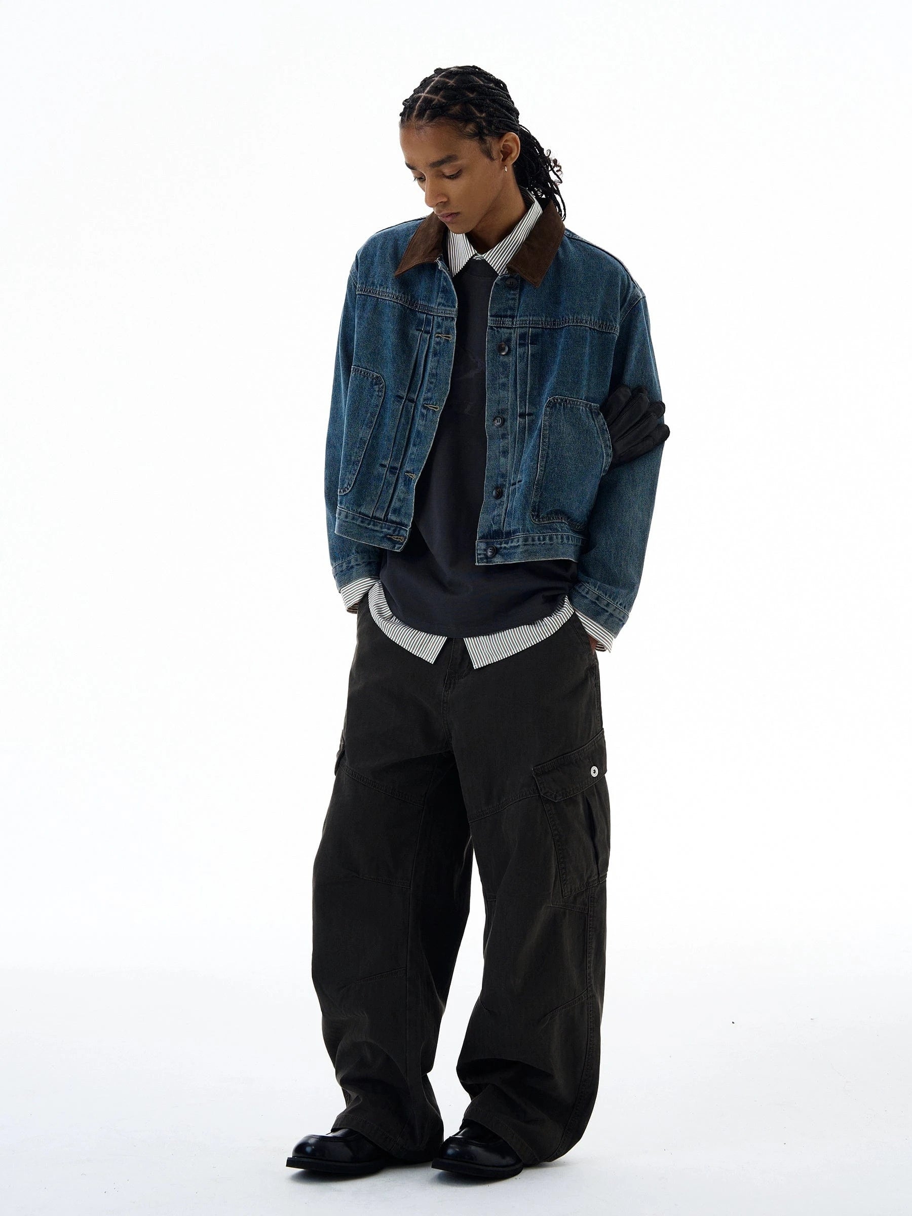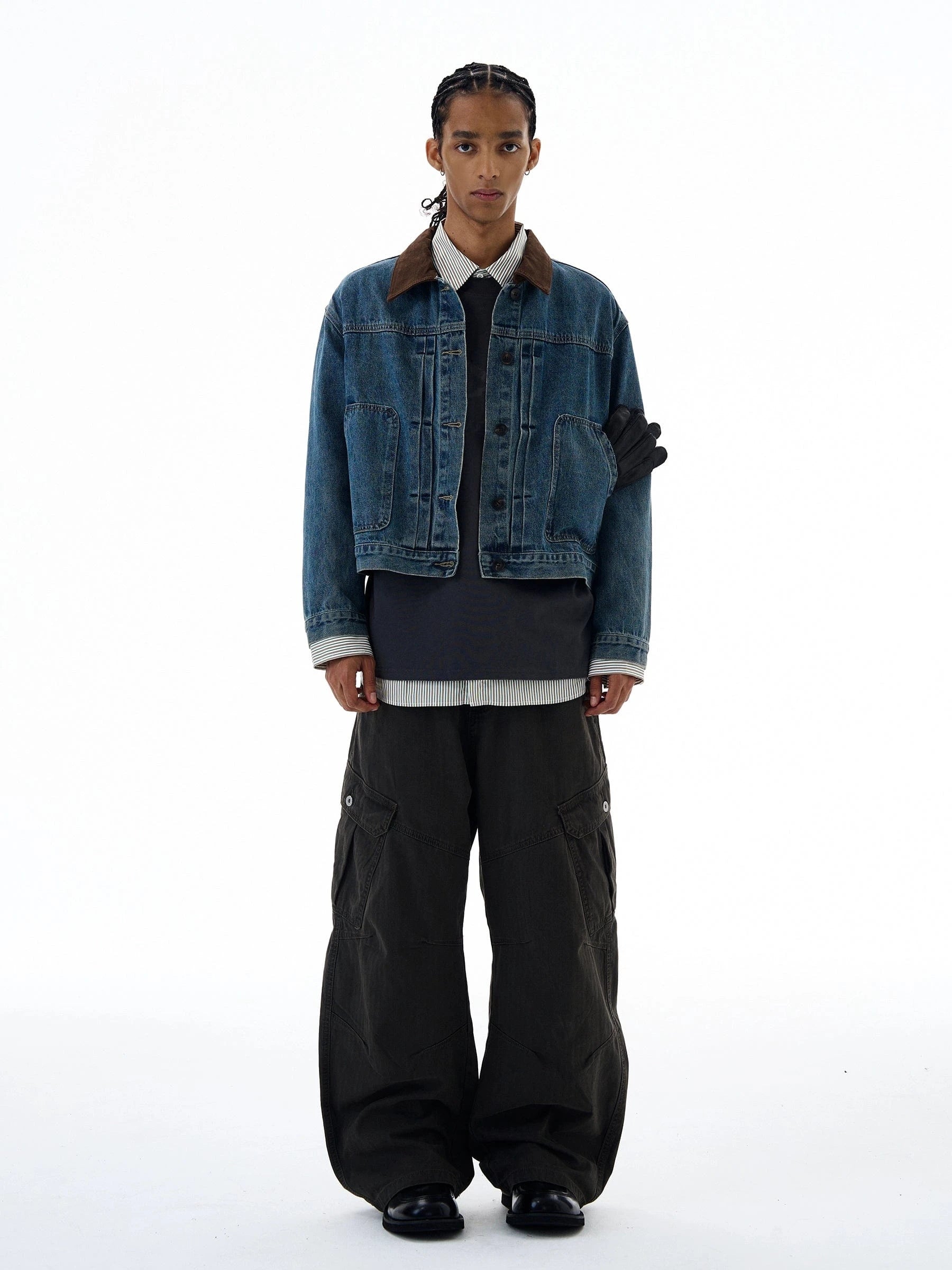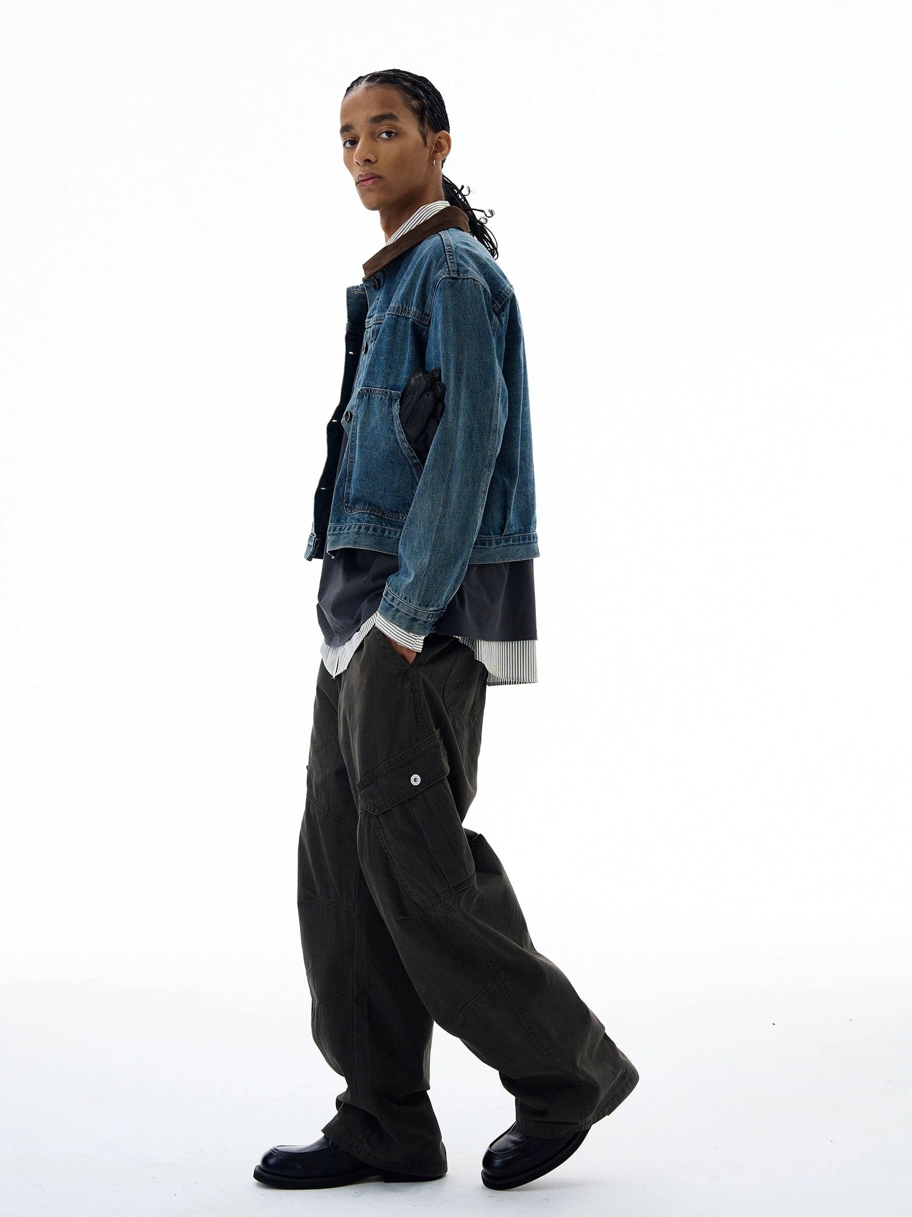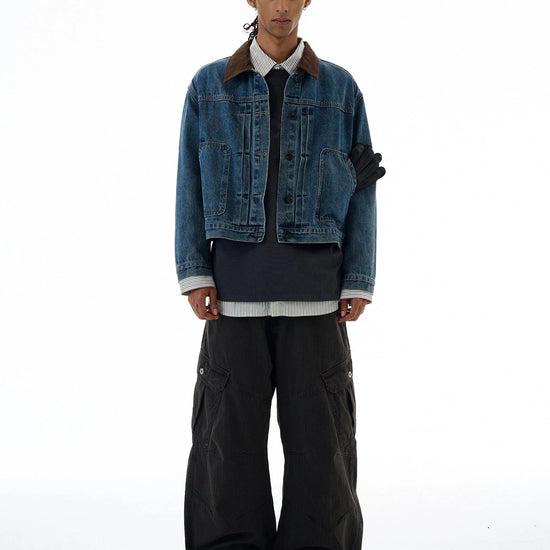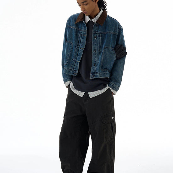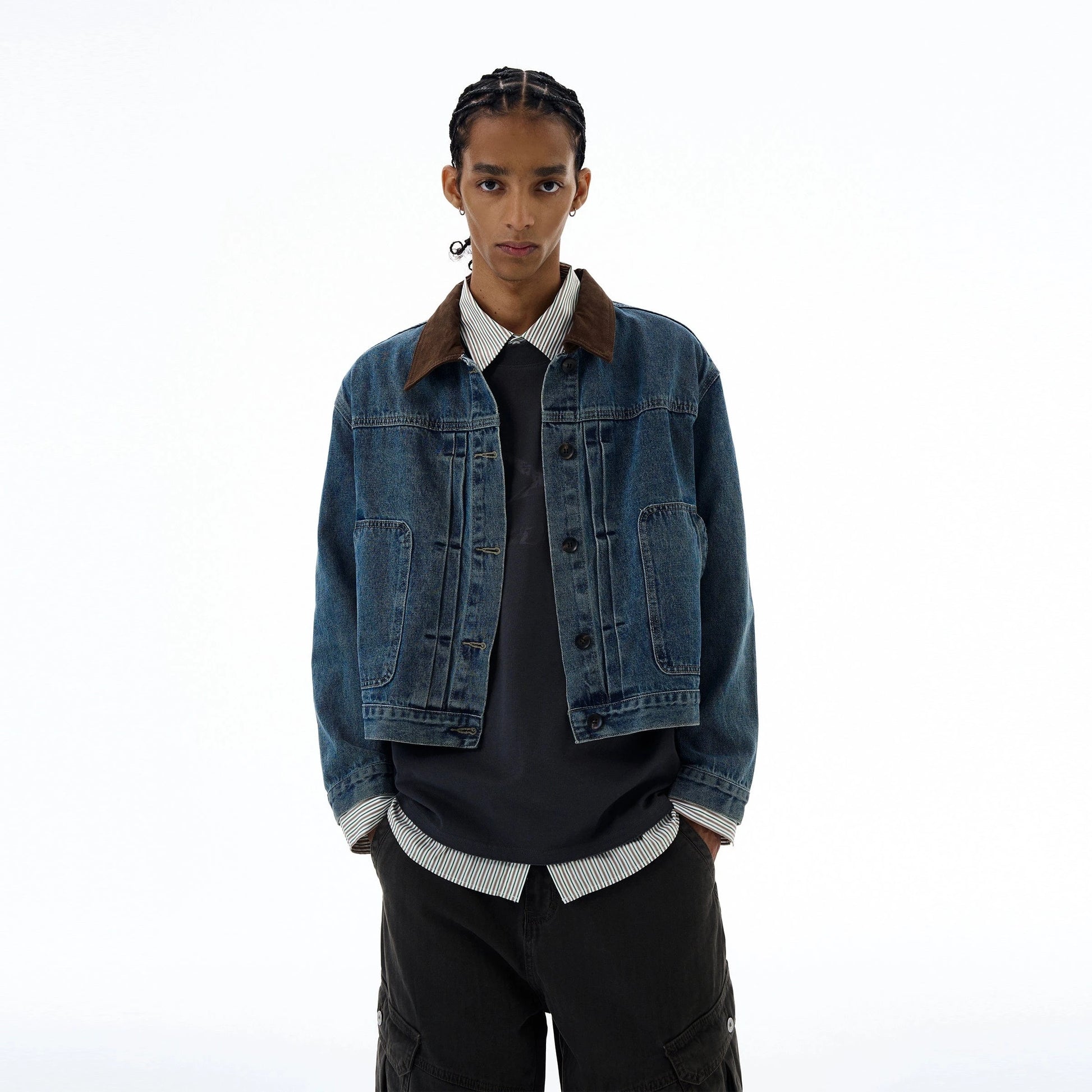 RT No. 19557 Brown Collar Denim Jacket combines a classic blue denim body with a distinctive brown collar for contrast. This jacket features a loose fit and a button-up front for versatile styling and everyday wear.