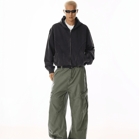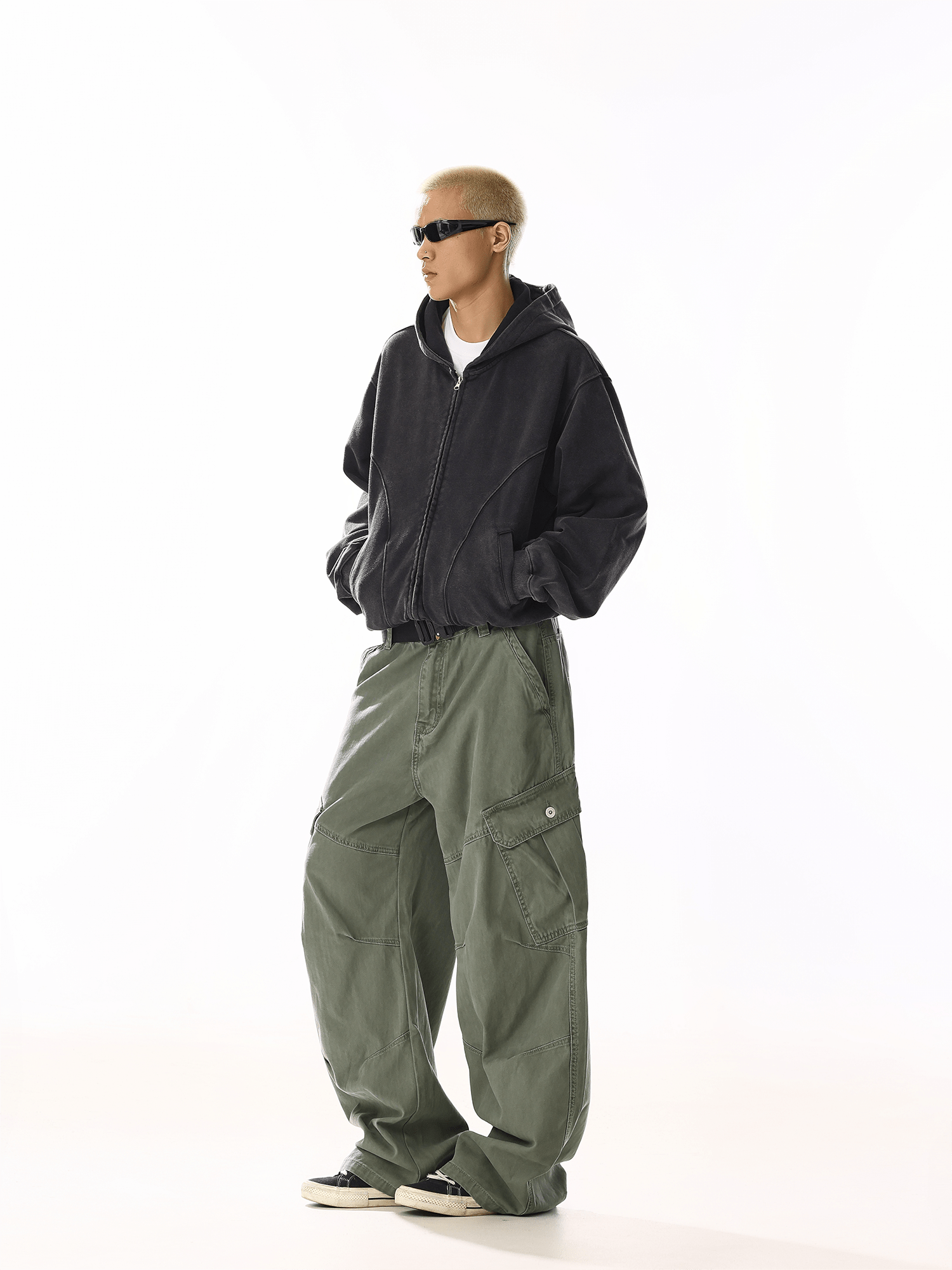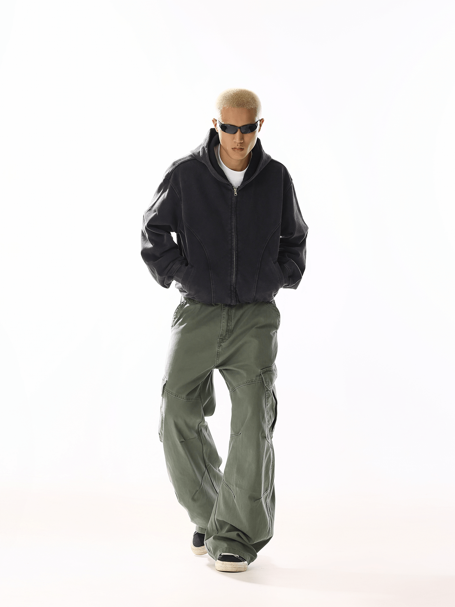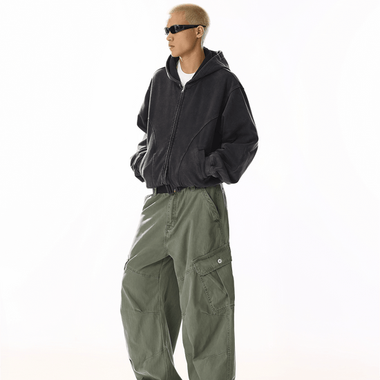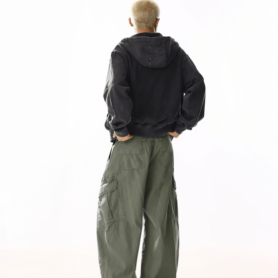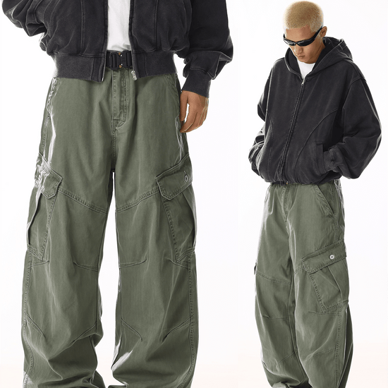 Step into a rugged, utilitarian silhouette with these reconstructed cargo pants in a deep army green. The straight fit and draped fabric deliver a clean, versatile look suited to everyday wear.