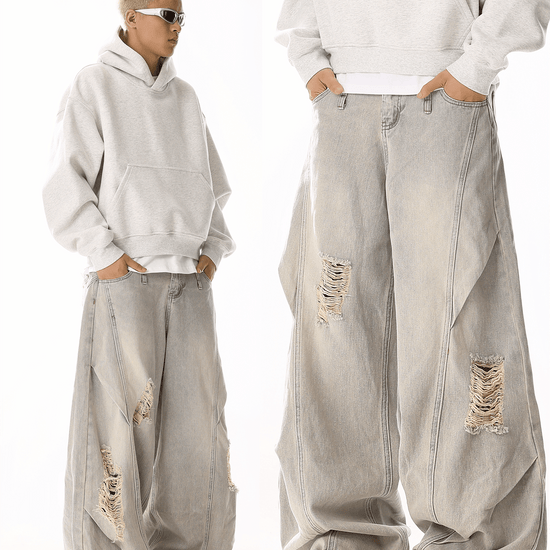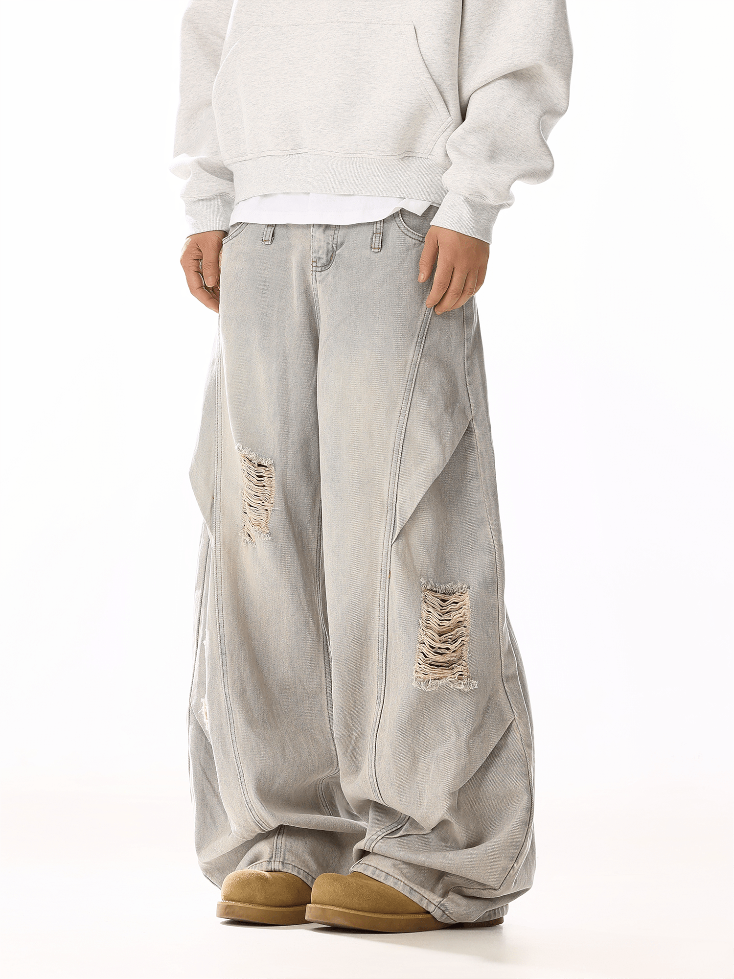 RT No. 19805 RECONSTRUCTED CREAM-BLUE WIDE STRAIGHT JEANS are designed to pair modern style with everyday practicality. Crafted from durable denim, this pair features a reconstructed finish and ripped detailing for a contemporary edge that works with tees, hoodies, and jackets.