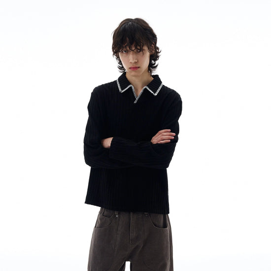 A refined knitted pullover featuring a stitched collar, crafted with restraint and elegance. Its timeless silhouette and two-color palette embody quiet luxury, offering enduring value and a sense of careful provenance for discerning wardrobes.