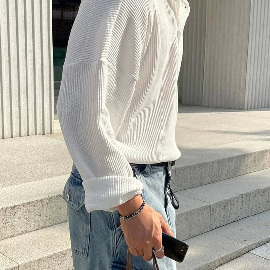 A refined, heritage-inspired knit with a Henry collar, woven in premium waffle yarn for timeless refinement.