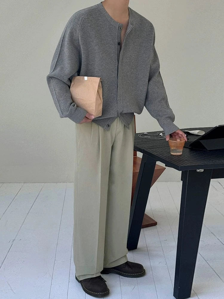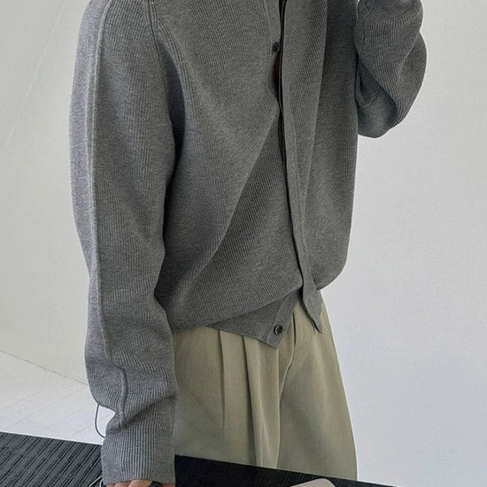 This gray knit cardigan embodies quiet luxury and enduring value through heritage craftsmanship and restrained, refined design for a timeless wardrobe.