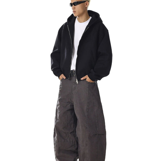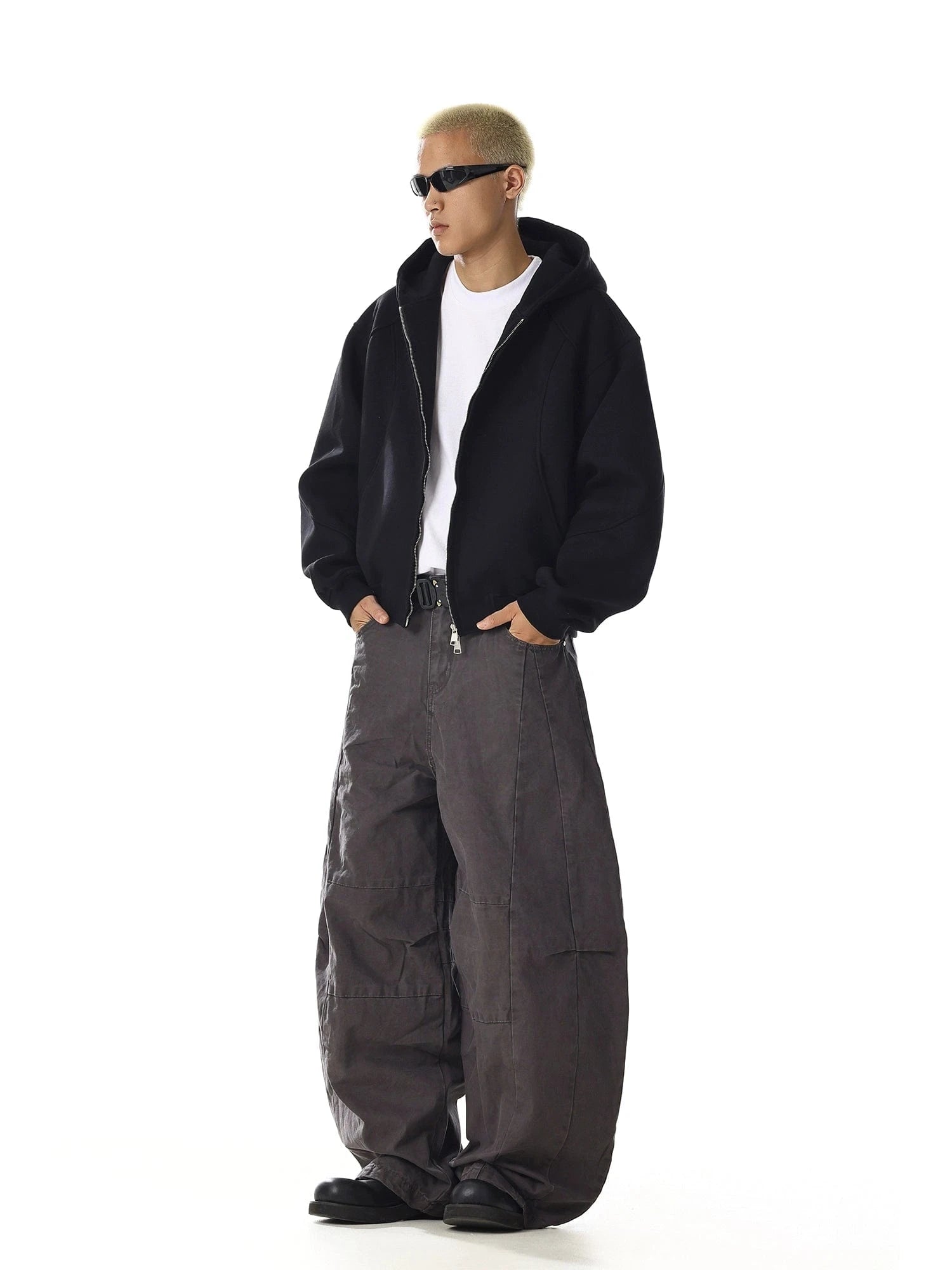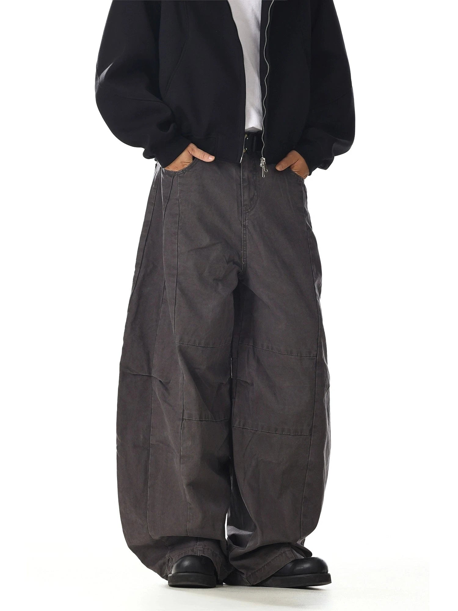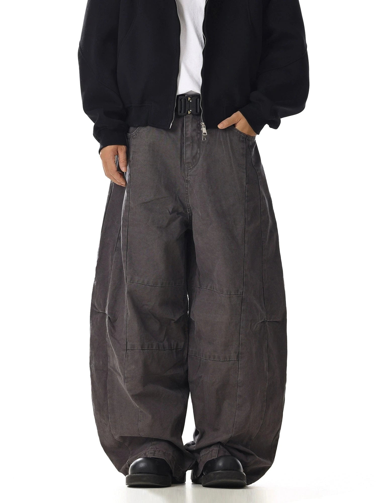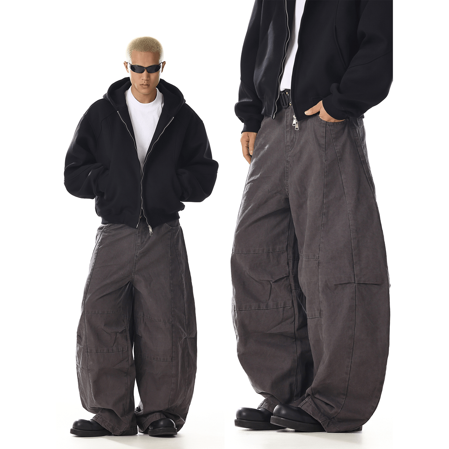 These gray, wide workwear pants fuse practical design with timeless craft, embodying heritage-inspired tailoring and enduring materials for refined everyday wear.