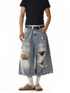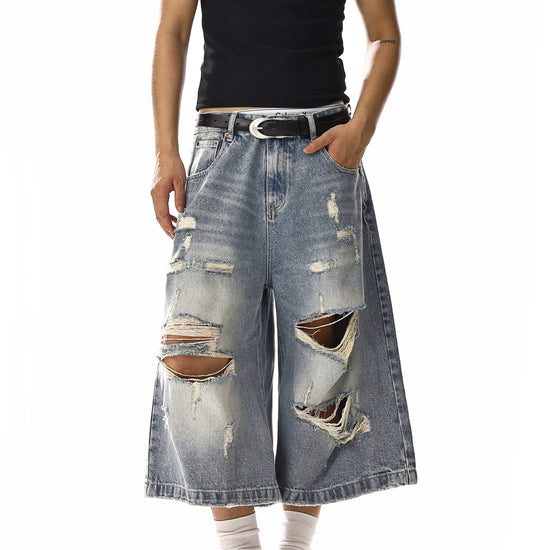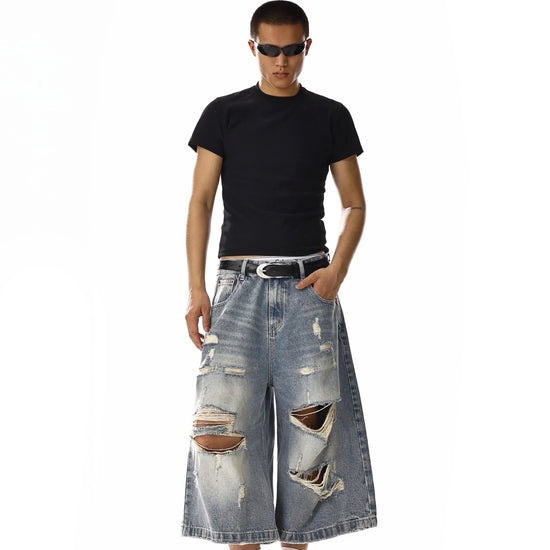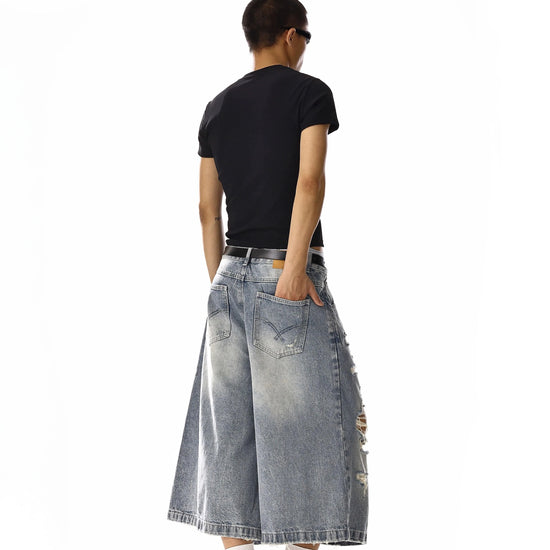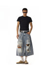 RT No. 18249 RIPPED BLUE DENIM SHORTS offer a rugged, casual edge for your everyday wardrobe. Featuring ripped and distressed detailing on classic blue denim and a baggy silhouette, these shorts deliver a relaxed, fashion-forward look.